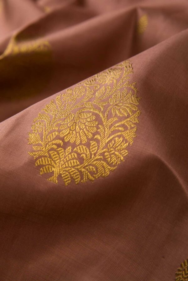 Brown Kanchipuram Silk Saree with Zari Butta on the body and Zari Border. Includes unstitched blouse.