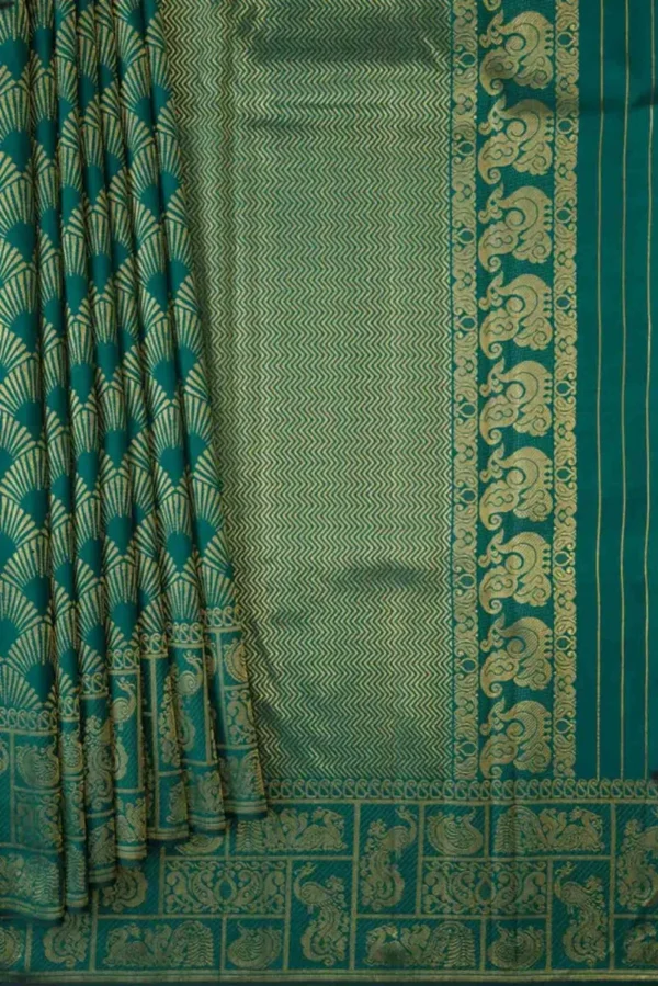 Green Dual Tone Kanchipuram Silk Saree with Zari Brocade on the body and Zari Border. Includes unstitched blouse.